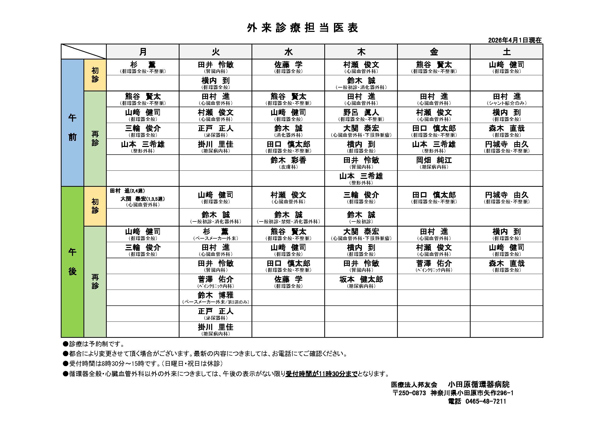 急な休診もございますので詳しくは病院受付(電話:0465-48-7211)までお問い合わせください